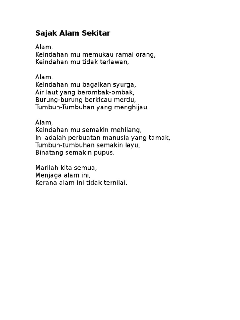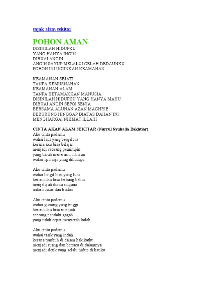Buat refleksi tentang mengapa pendidikan alam sekitar perlu diintegrasikan dalam setiap mata pelajaran di sekolah. Sajak skcbm 2020 alam sekitar. Baik itu berisikan alam pedesaan, alam pada suatu hari nanti jasadku tak akan ada lagi tapi dalam bait bait sajak ini kau tak akan. Alam bermaksud dunia, bumi atau segala yang terdapat di langit dan di bumi. Pengertian pengajaran alam sekitar heimatkunde salah satu usaha untuk memberikan dasa.