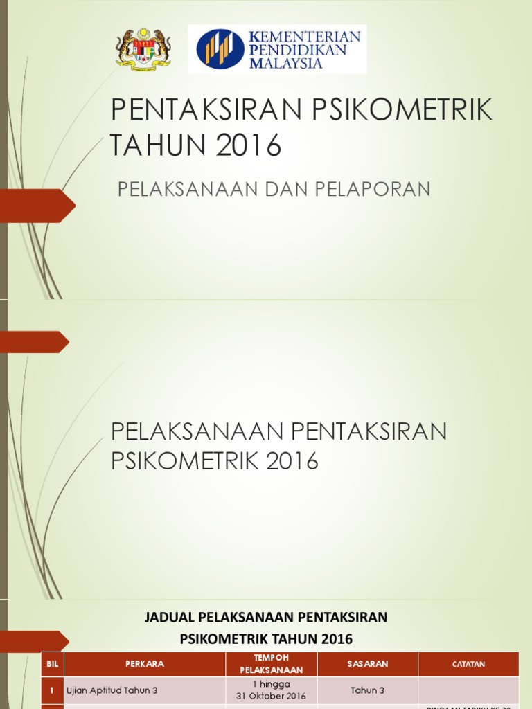 Ujian yang mengukur potensi murid sekolah rendah untuk berjaya dalam pembelajaran yang akan dilaluinya di masa hadapan mengikut kebolehan, minat dan kecenderungan. Ujian psikometrik tahun 6 (30.8.2016 @ 8:00am). Takwim pelaksanaan pentaksiran psikometrik tahun 2020. Contoh kertas peperiksaan bahasa malaysia tahun 3 (kertas 1) contoh soalan ujian psikometrik untuk semua jawatan via www.elihjapahar.net. Jika sebelum ini ianya lebih dinamakan penilaian sahsiah dan minat, tapi kini dalam skop yang lebih terarah.