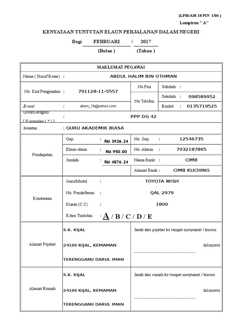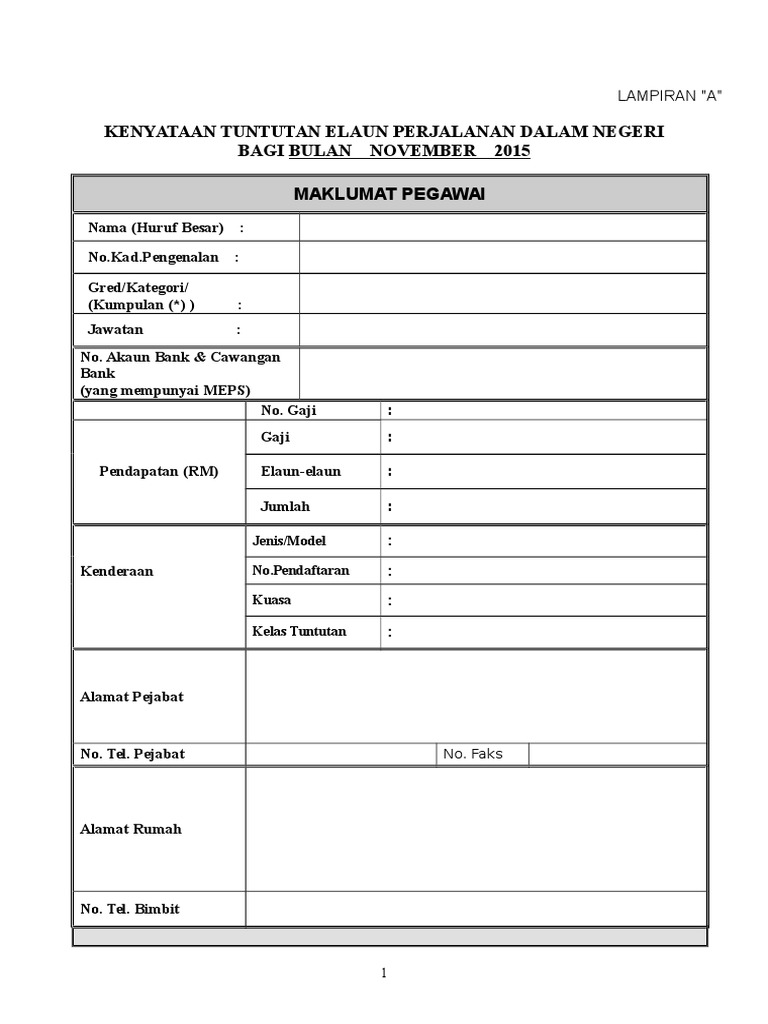 Borang tuntutan yang lengkap diterima selepas 3 haribulan akan ditunda bayaran ke bulan hadapannya. Kad pengenalan jawatan gred januari 2020 tidak berkenaan. Akuntan puncak di sebagian besar organisasi adalah para pengendali. Borang tuntutan elaun perjalanan dalam negeri maklumat pegawai pendapatan (rm) kenderaan alamat pejabat alamat rumah pegawai *diisi oleh pegawai yang layak membuat tuntutan perjalanan di bawah pp wp1.6. Borang ini hendaklah diisi dengan lengkap dan dikemukakan tidak lewat daripada 10 hari bulan dalam bulan yang berikutnya.