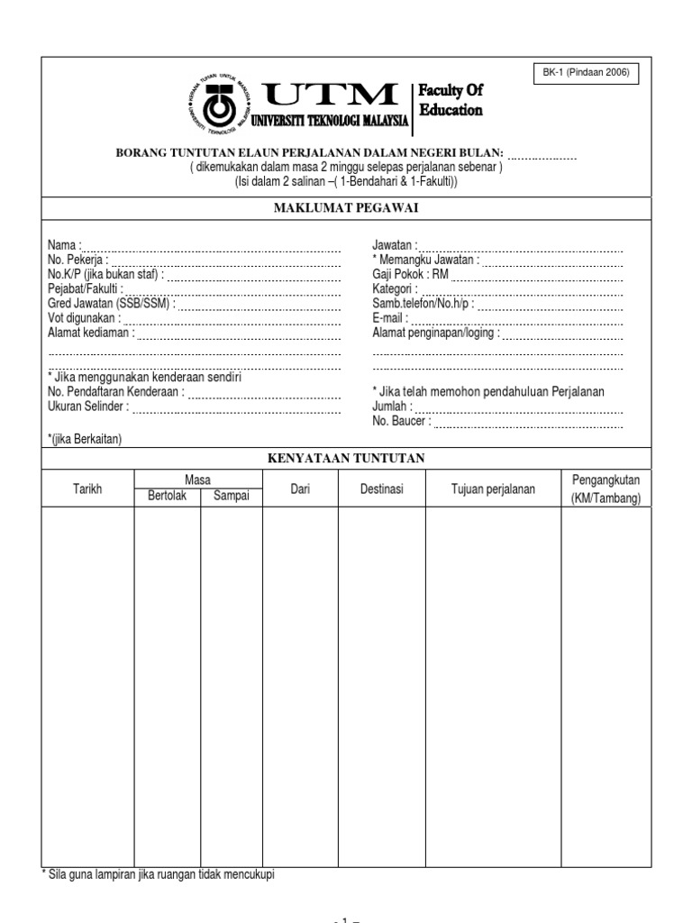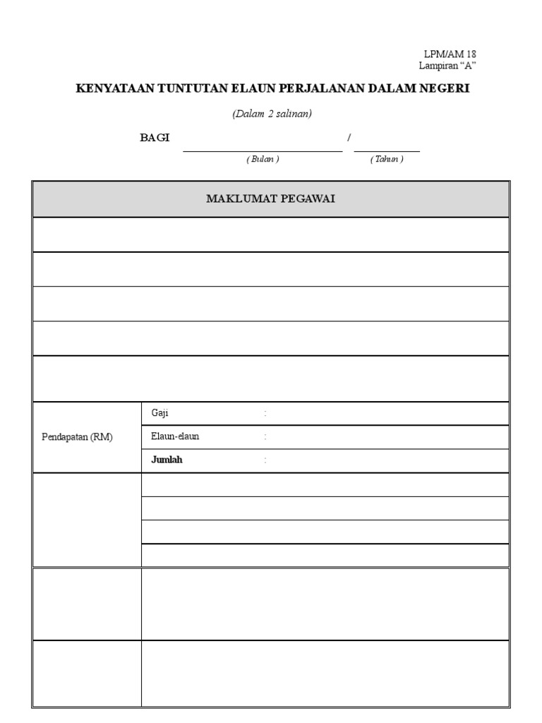 Borang ini hendaklah diisi dengan lengkap dan dikemukakan tidak lewat daripada 10 hari bulan dalam bulan yang berikutnya. Previousproduk hukum yang berkaitan dengan badan layanan umum (update 10 januari 2016). Jika perjalanan melebihi 240km dari ibu pejabat dan boleh dihubungi kapalterbang atau keretapi, tambang gantian akan diberi jika. Download lagu borang tuntutan perjalanan (3.22mb) dan streaming kumpulan lagu borang tuntutan perjalanan untuk melihat detail lagu borang tuntutan perjalanan klik salah satu judul yang cocok, kemudian untuk link download borang tuntutan perjalanan ada di halaman berikutnya. Panduan tuntutan perjalanan rasmi dalam negeri.